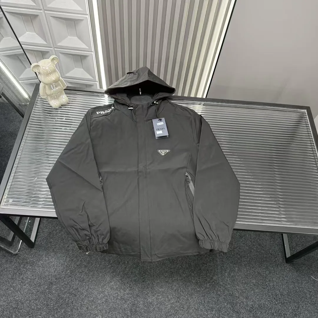 Empfohlene Oberbekleidung für den Frühherbst: Pradas Kapuzenjacke mit dreieckigem, stahlgeprägtem Logo und Schriftzug. Alle drei Logos sind identisch mit denen auf der offiziellen Website. Zoomen Sie hinein, um Details zu sehen. Foto mit der Originalkamera aufgenommen.
