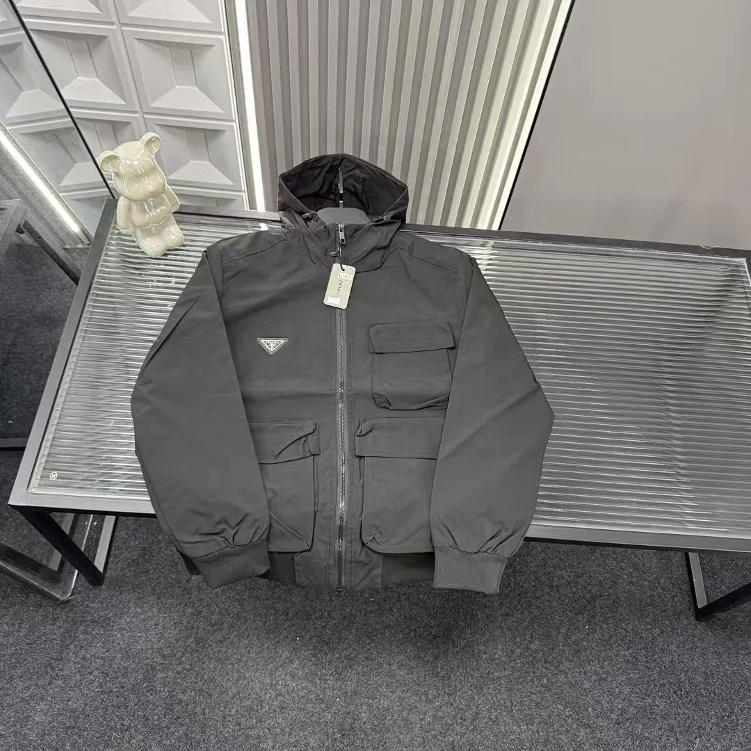 Empfohlene Oberbekleidung für den Frühherbst: Pradas Kapuzenjacke mit Dreiecksprägung und mehreren Taschen. Alle drei Etiketten sind identisch mit denen auf der offiziellen Website. Zoomen Sie hinein, um Details zu sehen. Foto mit der Originalkamera aufgenommen.