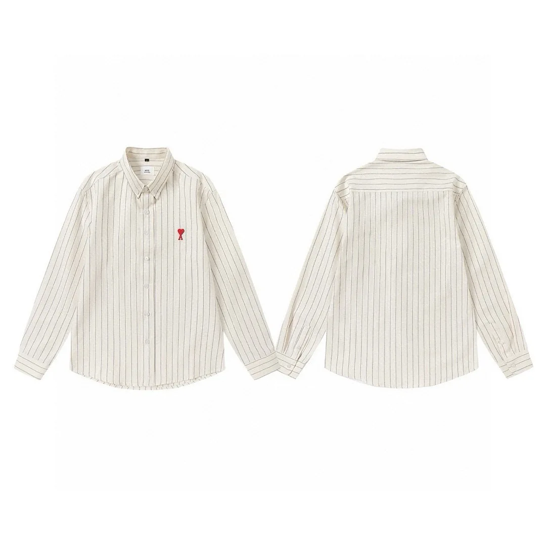 AMI PS SS Lockeres, langärmliges Paarhemd mit Knopfverschluss und kleinem roten Herz, bestickt, gestreift – Premium-Version