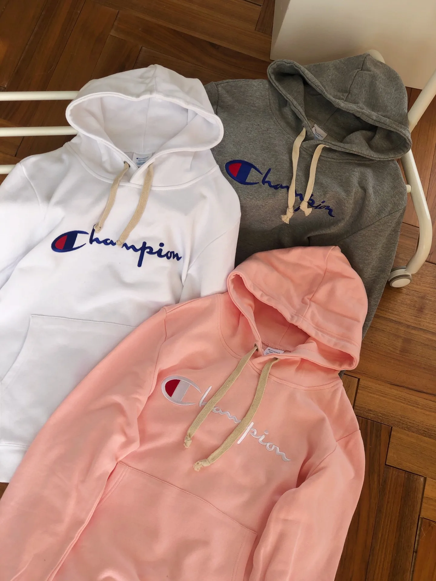 champ#champion Kapuzenpullover mit kursiver Stickerei. Acht Paar-Styles in verschiedenen Farben.