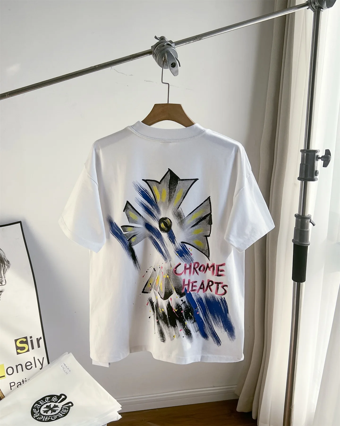 Premium-T-Shirt, starke Neuerscheinung: Chrome Hearts S/S Heavy Cross Ink Splash Graffiti Print Gold Rundhals Kurzarm-T-Shirt. Artikelnr.: