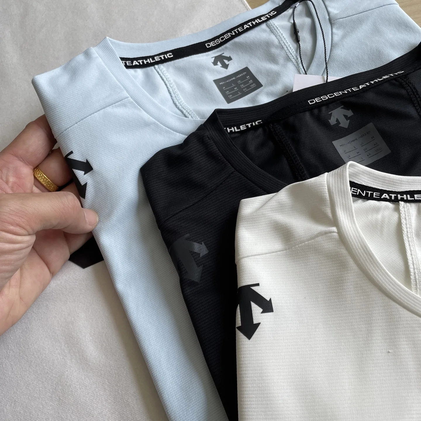 Details (Wie beim Artikel auf der Rückseite) DESCENTE / Descente Tricolor Sommer-Rundhals-T-Shirt mit umfassender Trainings-, Sport- und Fitnesstechnologie, Deodorant, feuchtigkeitsableitendes, schnelltrocknendes, atmungsaktives Kurzarm-T-Shirt