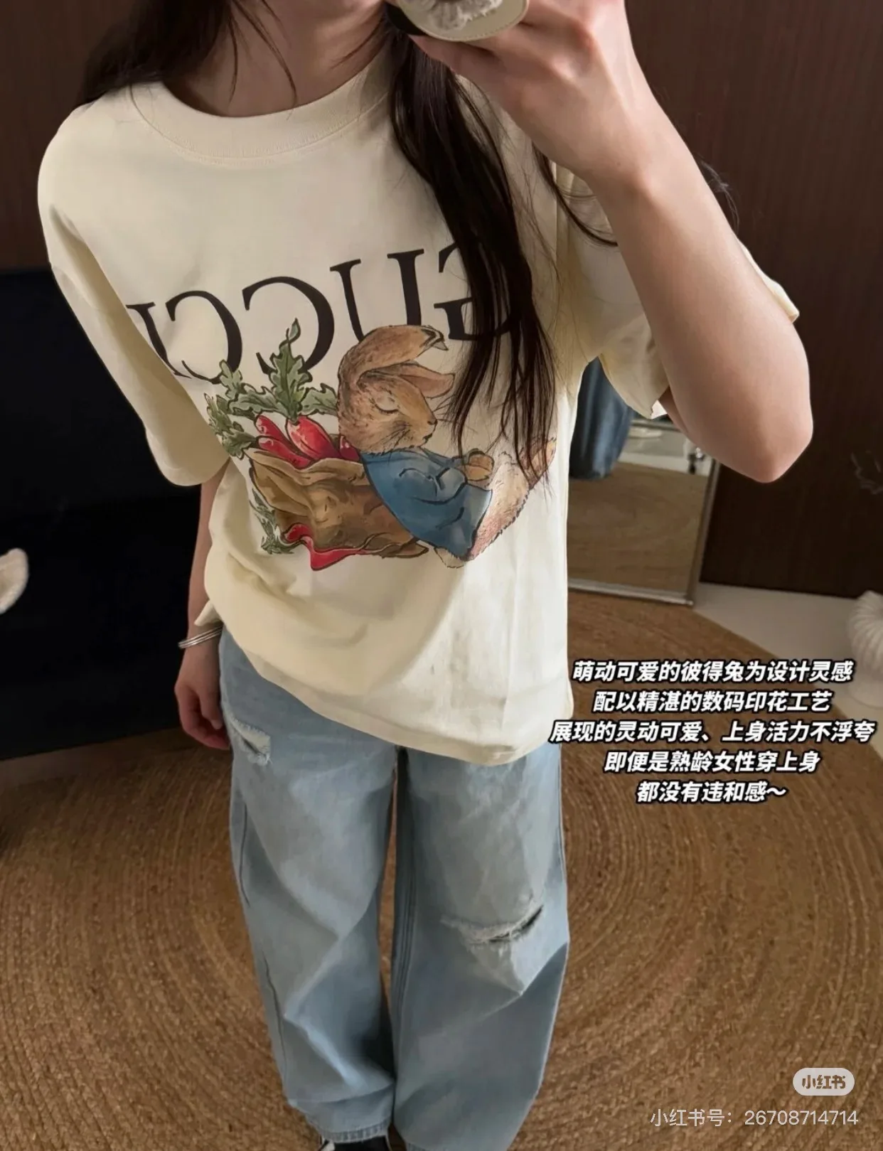 Neu eingetroffen! Exklusiv individualisiert, hochwertiger Gucci Sommer-Karottenhasen-Graphitdruck. Dieses Unisex-Kurzarm-T-Shirt mit Rundhalsausschnitt ist aus gekämmter Doppelgaze-Baumwolle gefertigt und hat einen karottenförmigen Hasendruck auf der Vorderseite. Diese heiße Neuerscheinung von GUCCI!! Ein neues Sommer-Kurzarmshirt für Paare in limitierter Auflage! Ich würde es nicht empfehlen, wenn es nicht ein großartiges Produkt wäre. Dieses vielseitige, zeitlose Kurzarmshirt ist ein absolutes Must-have! Sie werden definitiv mehr als eins kaufen wollen! Stoff und Schnitt sind hervorragend, und die Passform ist perfekt – eine schmeichelhafte Wahl für jeden! Vor allem ist es unglaublich hochwertig, mit präzisem Druck und großem Logo und sorgfältiger Verarbeitung! Der Stoff ist atmungsaktiv und unglaublich bequem, und die Verarbeitung ist sorgfältig. Das Design ist schlicht und elegant, ohne übertrieben aufwendig zu sein. Die Passform ist perfekt, und es engt nicht ein – eine großartige Wahl für jeden. Sehr empfehlenswert zum Selbstbehalten!