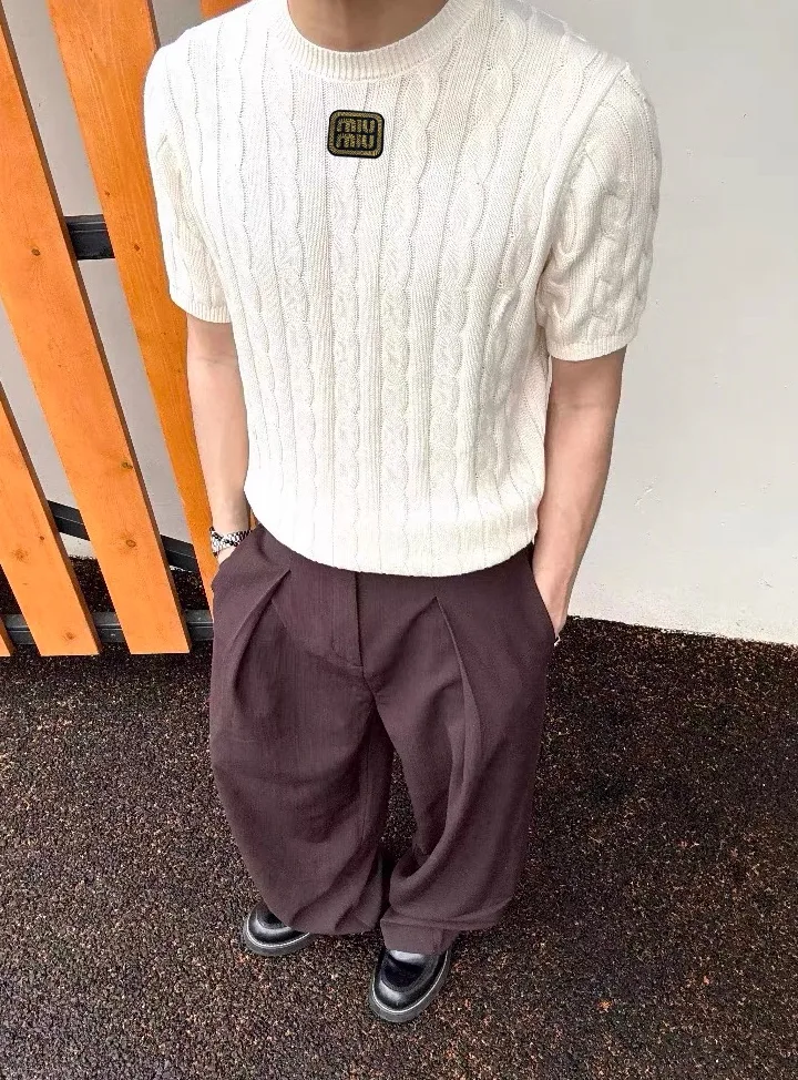 Der neue Miu Miu Sommer-Style: ein stylisches, trendiges Kurzarm-Shirt. Strukturierter Strickstoff sorgt für einen stilvollen, meisterhaften Look. Bequem und atmungsaktiv. Zopfmuster für einen luxuriösen und raffinierten Look. Individueller indischer Goldfaden-Patch auf der Brust. Stilvolle, entspannte Passform. Geeignet für Paare. Hergestellt in einer Premium-Fabrik mit komplettem Zubehör nach drei Standards.