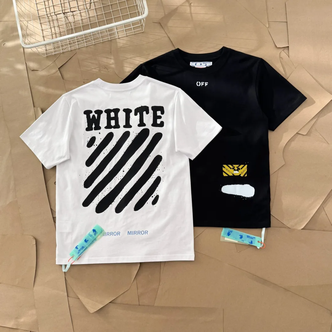 OW Neues, cremefarbenes, diagonal gestreiftes Kurzarm-T-Shirt mit Spritztinte für den Sommer | Stoff: Individuell gewebter, reiner, doppelt garnierter Greige-Stoff aus Baumwolle, zweimal gewaschen und vorgeschrumpft (vorgeschrumpft, um weiteres Einlaufen und Verformen zu verhindern). Muster: Klassische OS-Passform. Durchgehende Schulterstreifen, leicht überschnittene Schultern, leicht konturierter Saum und gerippte Bündchen. Druck: Rückseite bedruckt mit importiertem digitalem Direkttintendruck auf einer importierten Ellipsenmaschine für reine Farben, gestochen scharfe Bilder und Hochtemperatur-Heißprägung zur Verstärkung! Vollständig maßgeschneiderte, originelle Accessoires! Strenge Qualität! Dieselbe Qualität wie auf der Theke! Vergleichen Sie bedenkenlos mit Top-Versionen! Das Neueste auf der offiziellen Website: SS-Kragenetikett, Waschetikett, Hängeetikett und Verpackungsbeutel werden alle gleichzeitig aktualisiert.
