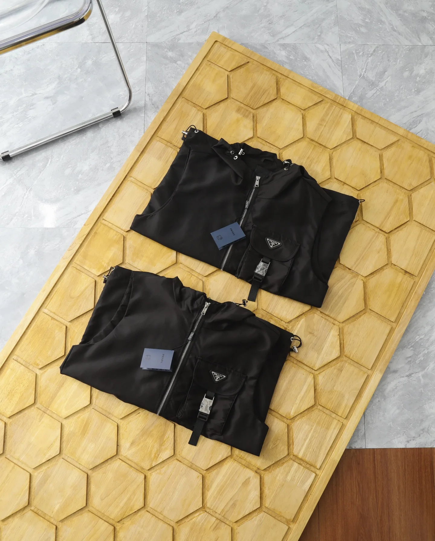 Neu eingetroffen | Prada SS – Einfarbige, ärmellose Weste aus recyceltem Nylon mit Reißverschluss und großer Tasche