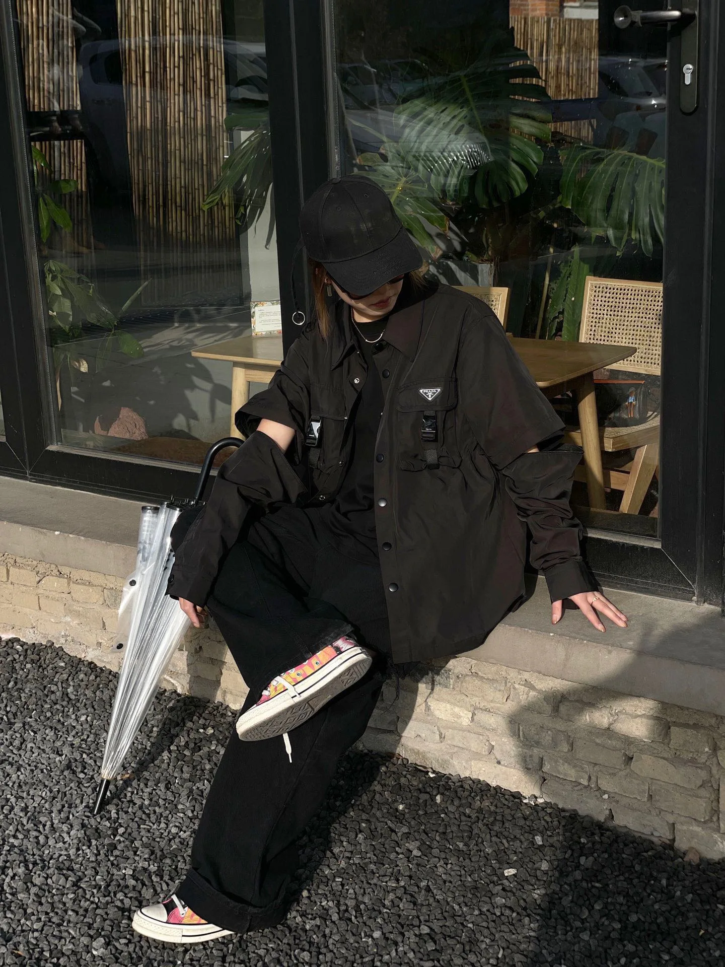 Pradas abnehmbares, zweiseitig umgedrehtes Dreiecksabzeichen, maßgefertigt aus recyceltem Nylon, und eine Hemdjacke mit Stehkragen. Dieser exklusive High-Street-Look ist ein Must-have für Prominente, und derselbe Stil wird auch als Model getragen. Alle Besätze sind maßgefertigt und werden in perfektem Zustand geliefert!