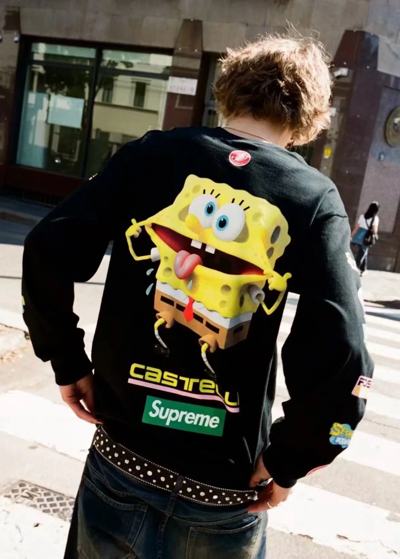 Supe x SPONGEBOB SQUARENTS x CASTELLI Collaboration SS WEEK Racing L/S T-Shirt. Unisex-Langarmshirt mit Rundhalsausschnitt und verspieltem Spongebob Schwammkopf-Print.