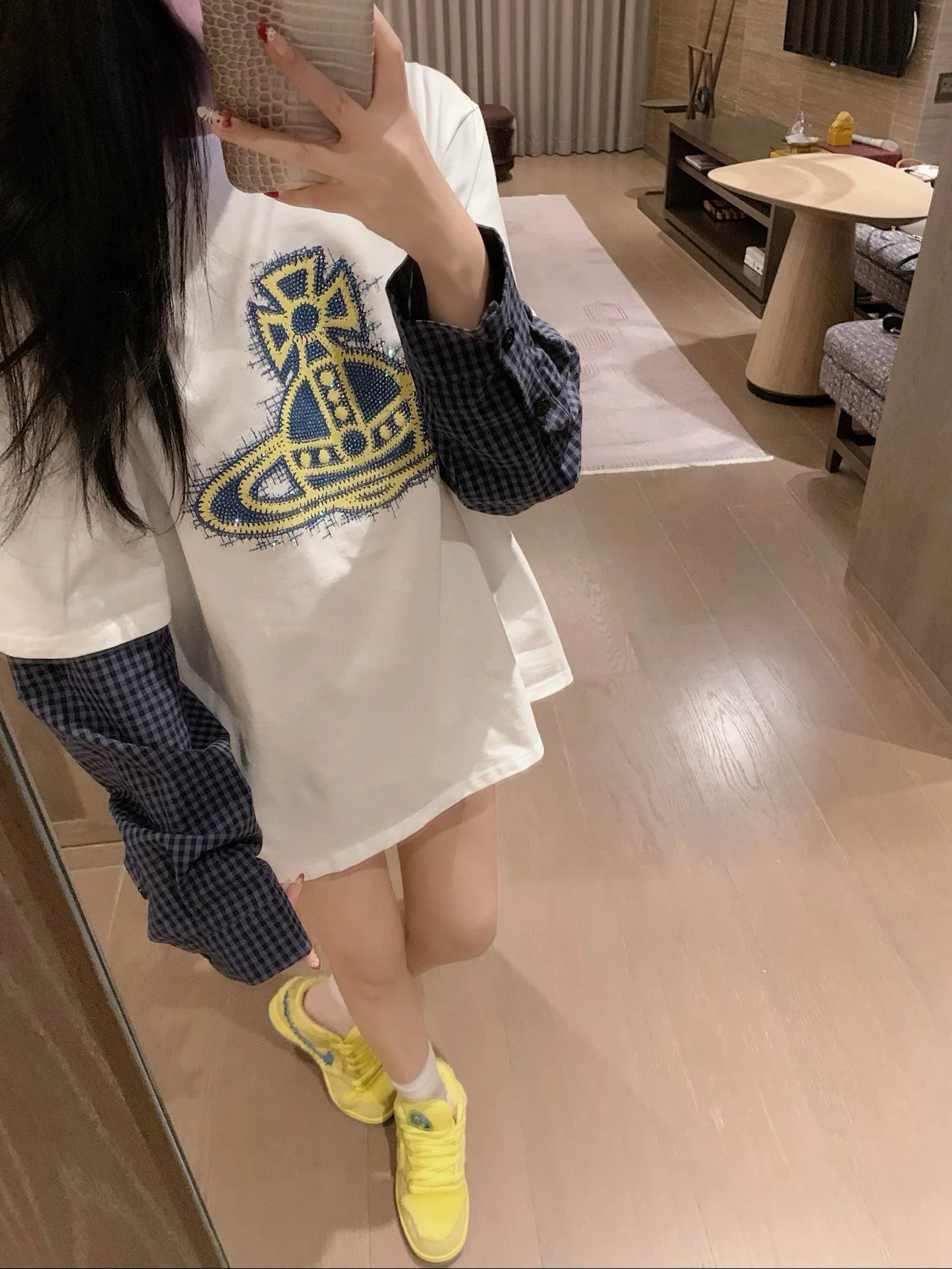 Vivienne Westwood – Zweiteiliges T-Shirt mit „Queen Mother Saturn“-Print und karierten Ärmeln in Rautenoptik