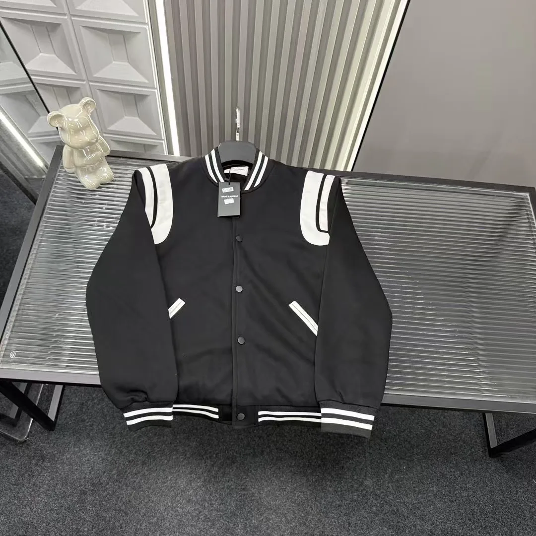 Empfohlene Oberbekleidung für den Frühherbst: Saint Laurents schwarz-weiße Baseballjacke mit Stehkragen und Colorblock-Muster. Die Jacke trägt alle drei Etiketten, passend zur offiziellen Website. Zoomen Sie hinein, um Details zu sehen. Foto mit der Originalkamera aufgenommen.