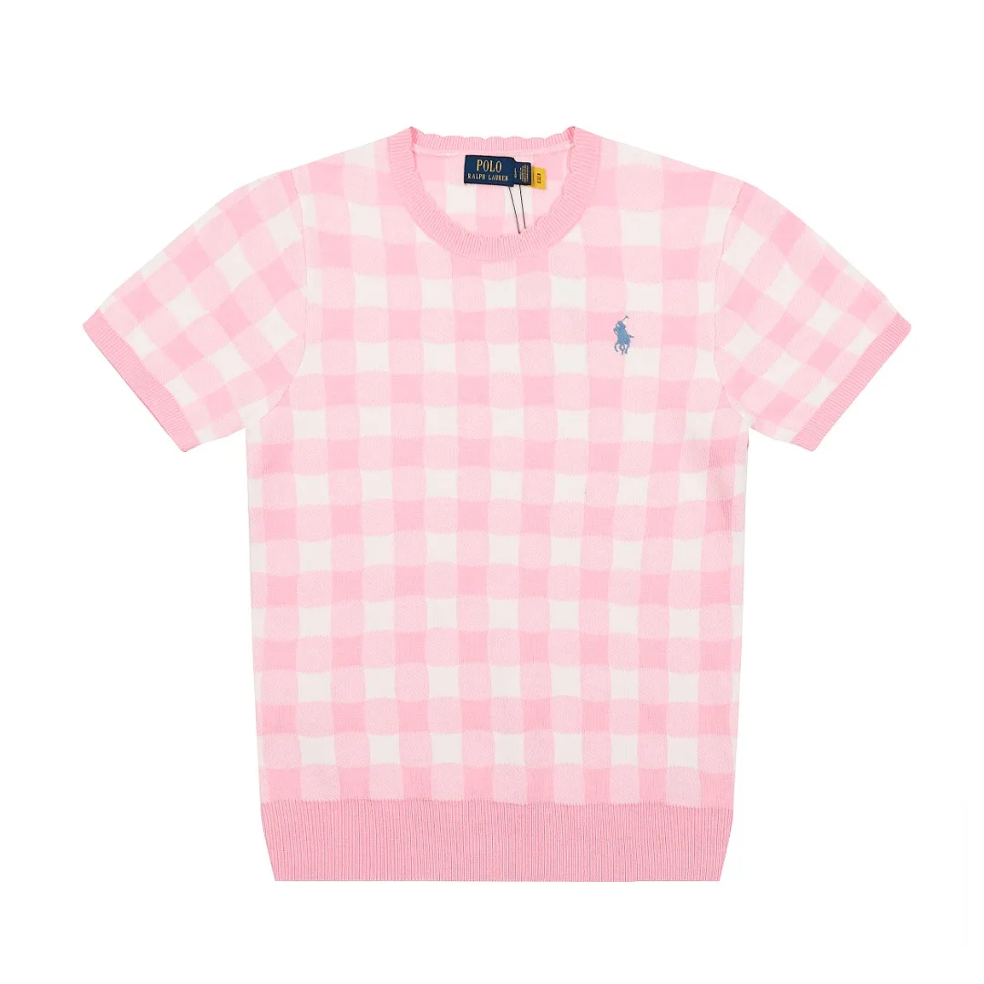 Ralph Lauren Karo-Jacquard Basic Strickpullover mit Pony-Logostickerei, Rundhalsausschnitt, kurzärmlig