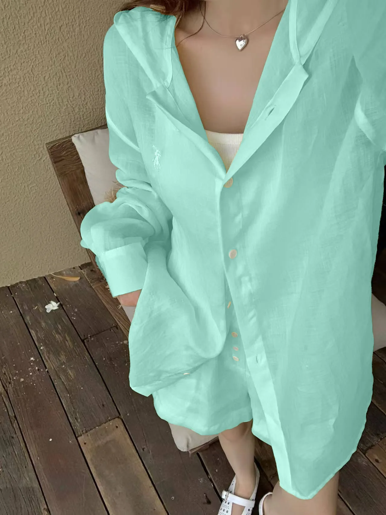 Ralph Lauren Leinen-Shorts-Set mit Kapuze. Dieses Set ist schlicht und lässig und verleiht dem Outfit einen stilvollen Lagenlook. Das Oberteil aus Ramie-Stoff hat eine klassische Kapuze und überschnittene Schultern.