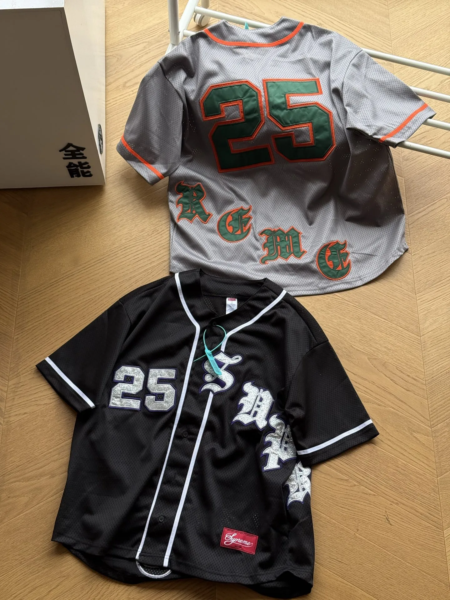 Erhältlich für Unisex-Supe SS WEEK Old English Baseball-Trikots. Kurzarmtrikots aus Twill-Netzgewebe mit Applikationen.
