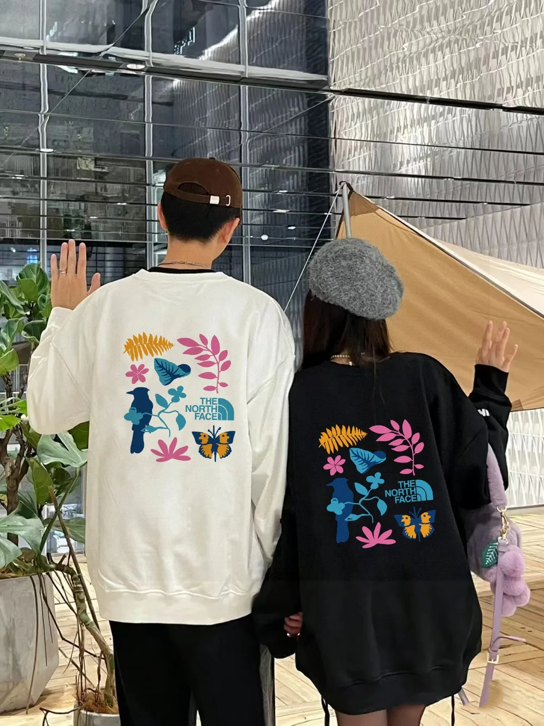 Die neuesten Rundhals-Sweatshirts mit Monogramm-Logos vorne und hinten sind am North Face TNF-Counter erhältlich.