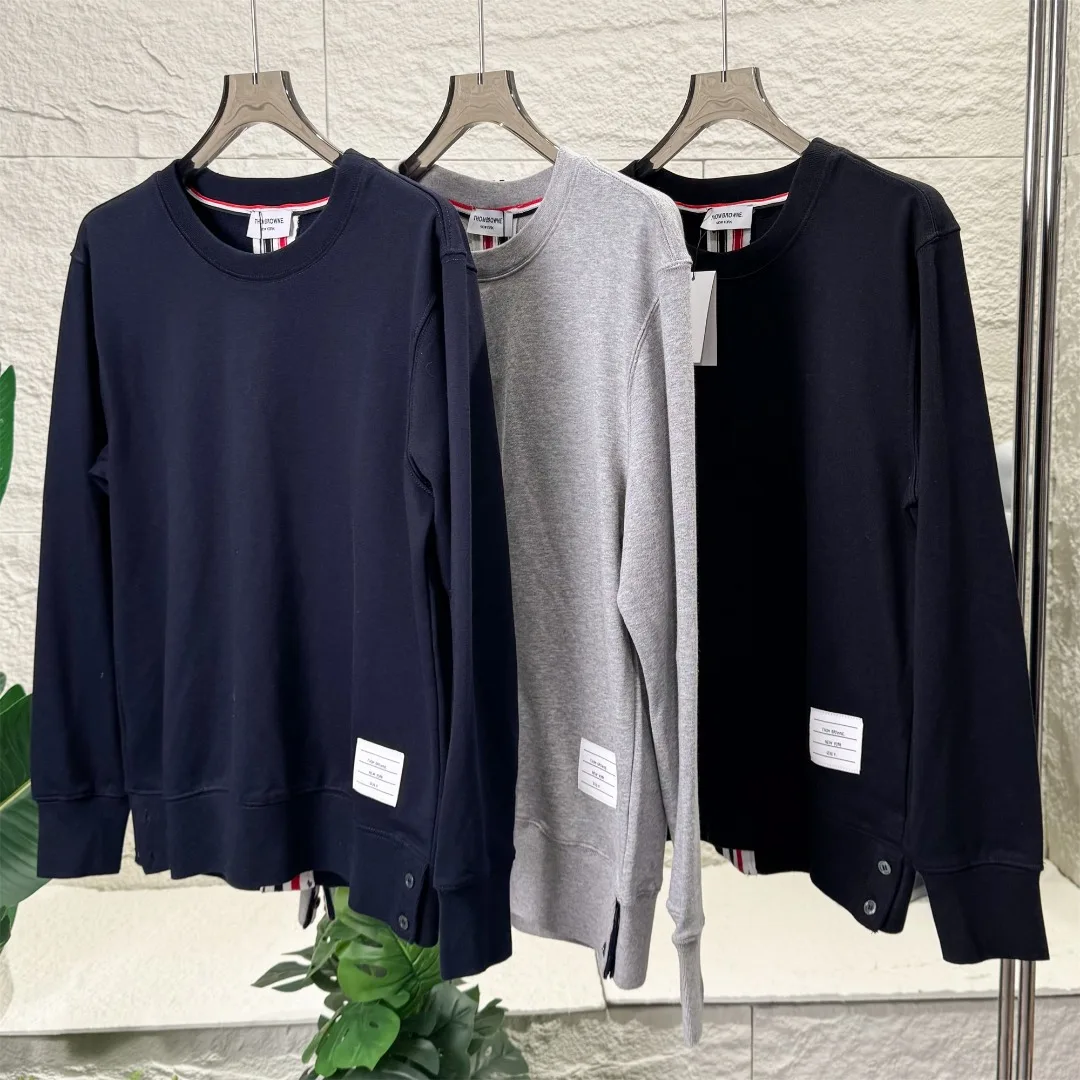 Thom Browne TB Classic Herbst/Winter Frottee-Sweatshirt mit Rundhalsausschnitt, Unisex. Hergestellt aus Originalstoff, bietet dieses stilvolle und klassische Modell eine entspannte und dennoch natürliche Passform für hohen Tragekomfort. Das klassische Vier-Streifen-Design an den Ärmeln sorgt für einen Lagenlook und unterstreicht die Attraktivität der Marke. Extrem einfach zu stylen, ohne komplizierte Designs oder Anpassung an andere Modelle. Stilvoll und einzigartig, unglaublich vielseitig und ein Must-have für Prominente.