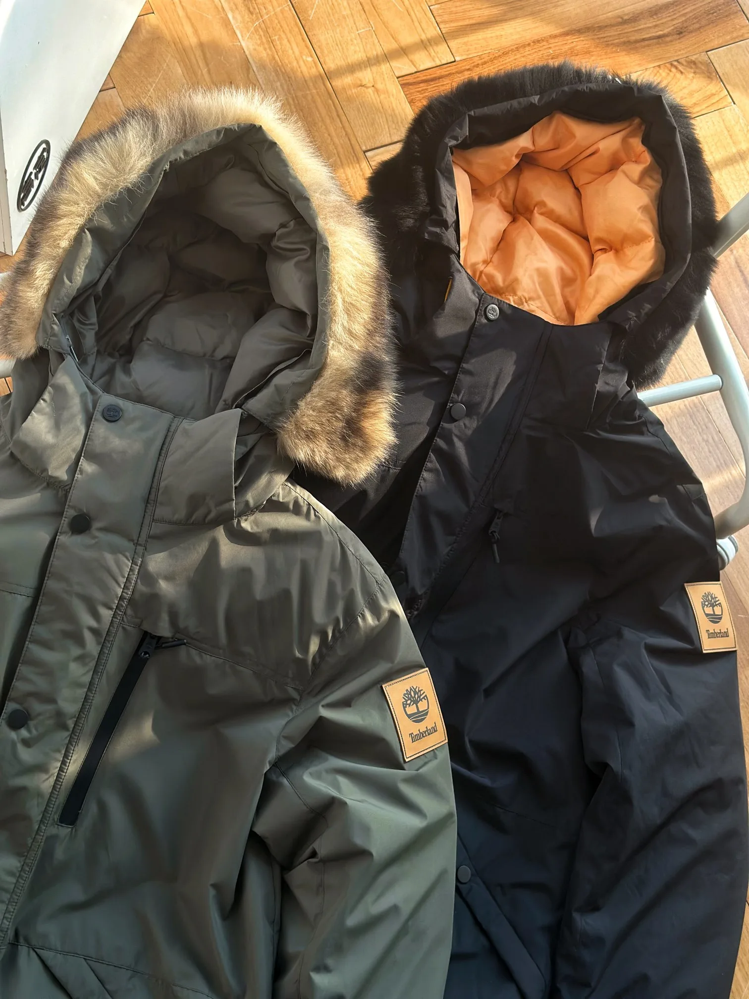 Timberland Neue mittellange Outdoor-Daunenjacke mit Kapuze und Pelzkragen