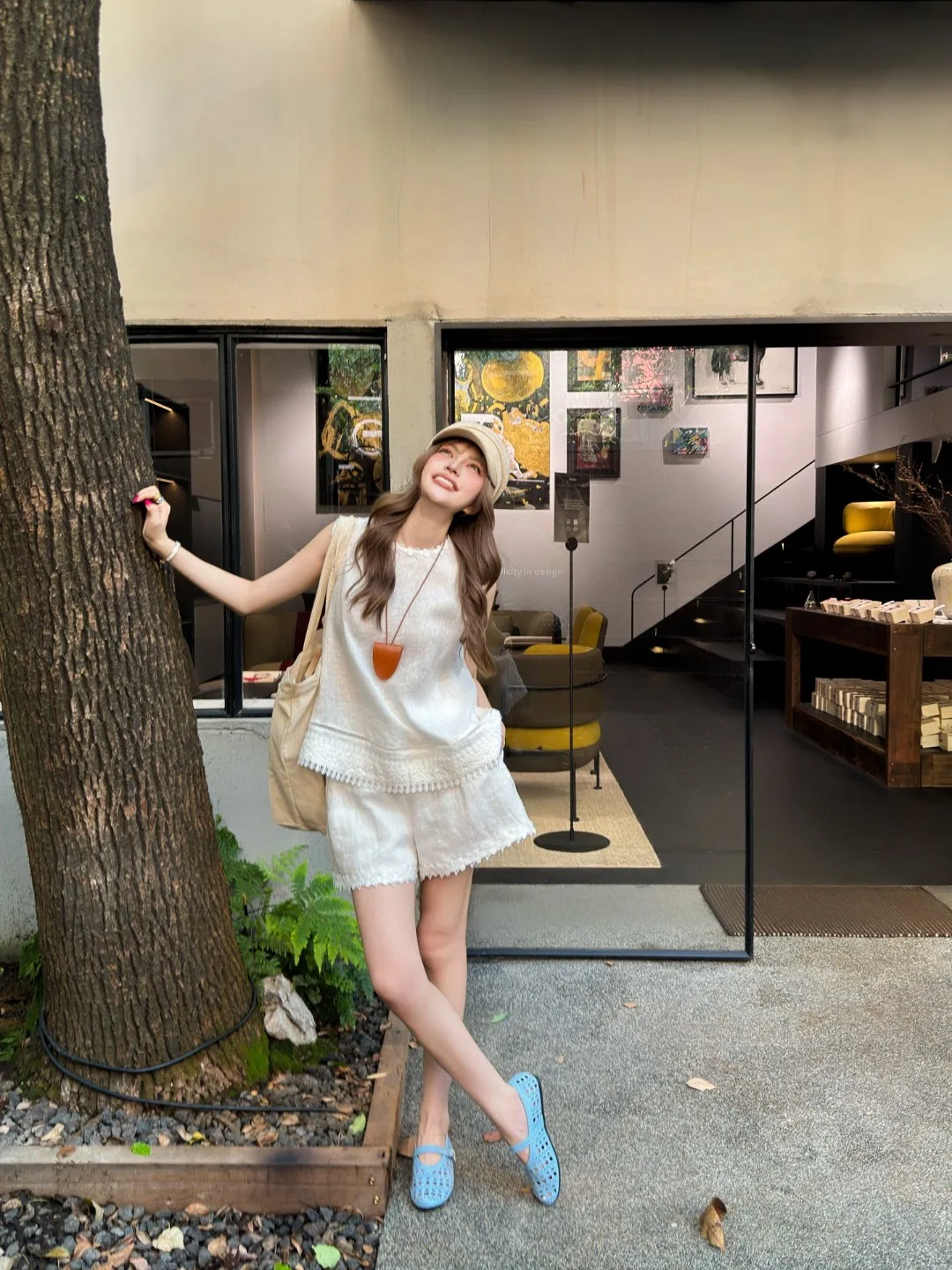 Neu erschienen: Der neue Valentino SS-Anzug. Der fliessende, nicht klebende Stoff aus 100 % Leinenmischung ist leicht, weich und griffig. Das A-Linien-Oberteil zaubert eine schmeichelnde, schlank machende Silhouette. Der wasserlösliche Blumensaum verleiht einen stilvollen Touch. Kombinieren Sie dazu die passenden lässigen Shorts.